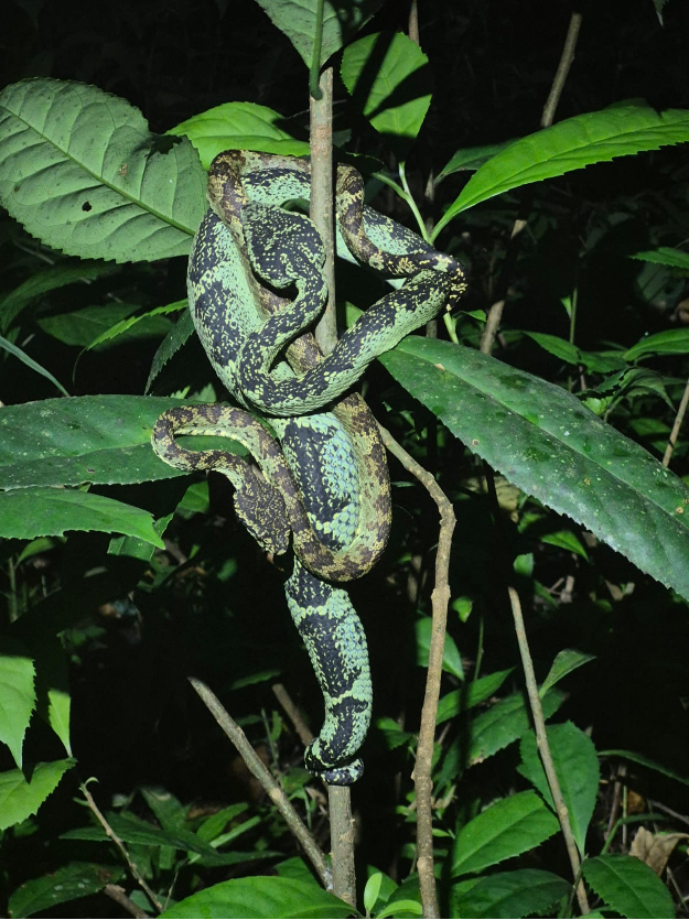 While the meetings and discussions provided essential context for understanding conservation challenges, it was during a night herping excursion that I felt most directly connected to the biodiversity we had been discussing. That evening would become the personal highlight of my visit to Wayanad. With a local guide, we entered the jungle after dark, our flashlights sweeping across leaves and branches. We spotted several frogs, delicate vine snakes, and what felt like an endless stream of leeches. Still, I had one specific hope: to find the Malabar pit viper, an arboreal snake so well camouflaged that it often goes unnoticed, despite its striking green and brown patterns. As time passed without a sighting, I joked that we would not leave until we found one. Then, just as we were about to head back, our guide suddenly stopped and pointed to a nearby branch inside of the thicket. There, nearly invisible against the jungle background, was a pair of Malabar pit vipers mating, a rare and mesmerizing moment that made the entire night unforgettable.